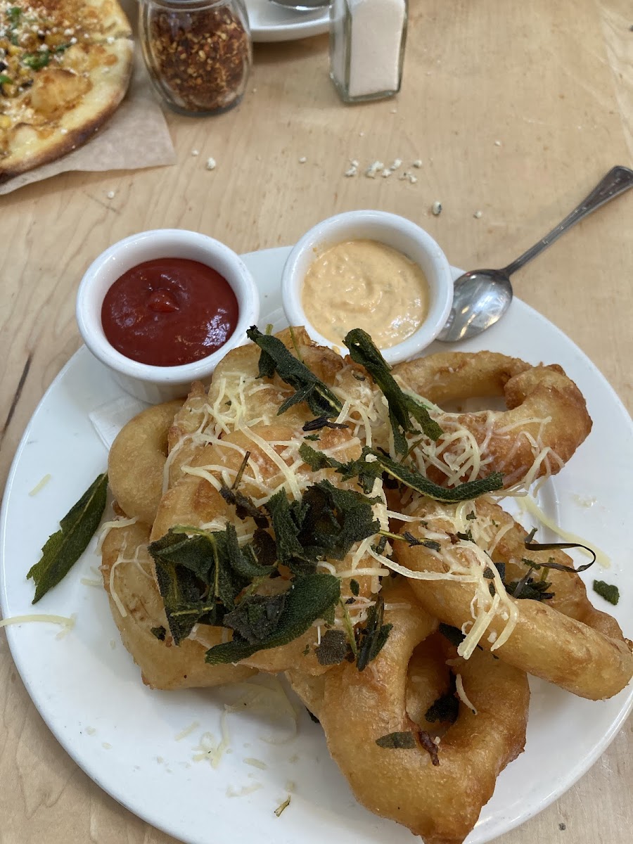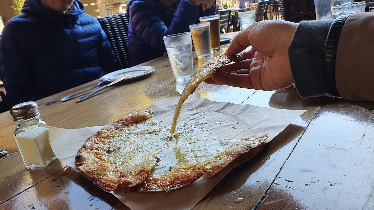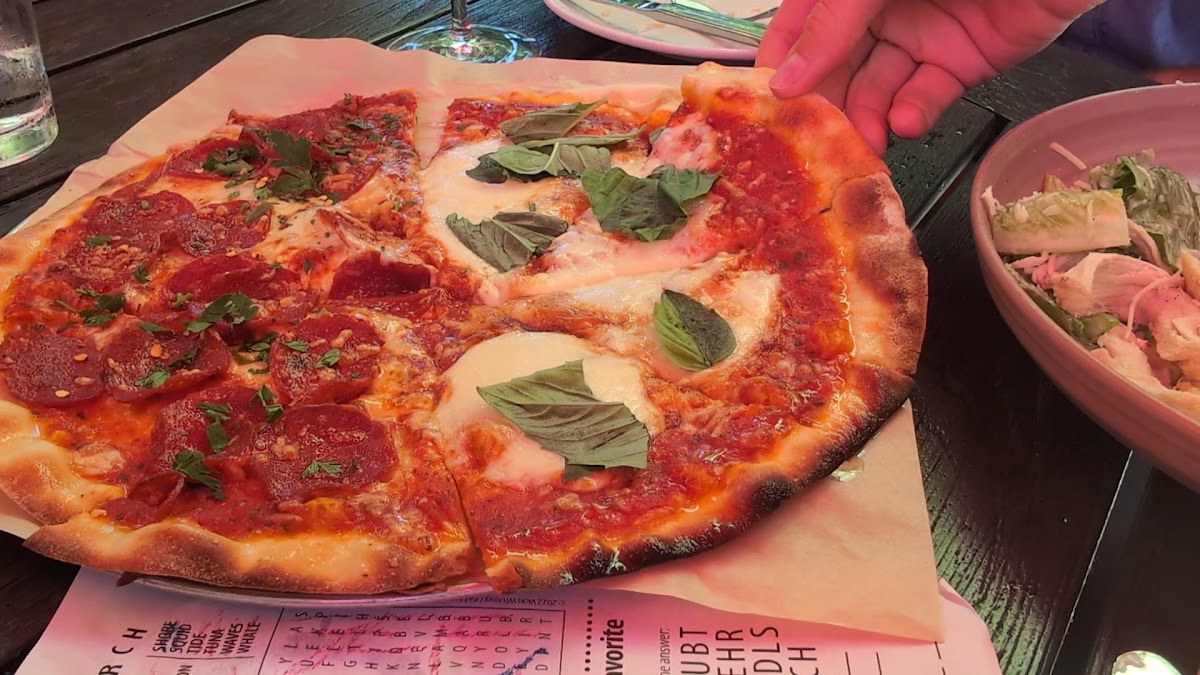 We stopped by for some casual pizza after our tasting. Walked passed a local who recommended it and he was on point. Very delicious food and very kind staff. They had a beautiful outdoor space for dogs with heat lamps. The fountain area was closed off but we were the only ones outside. It was pouring rain and hen we went but we were in an alley way which was covered. So almost an indoor outdoor feel. Good food!